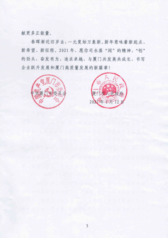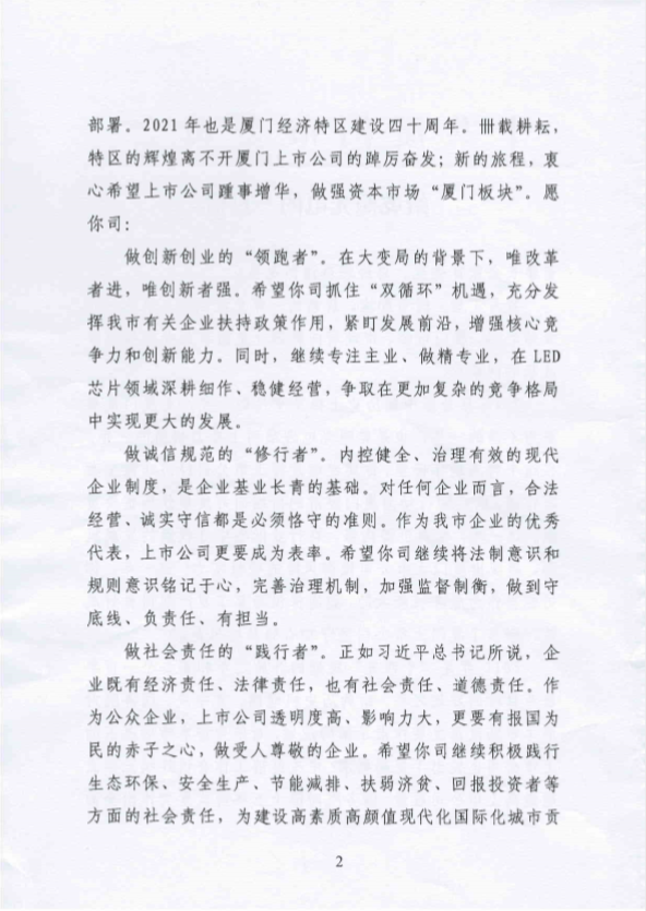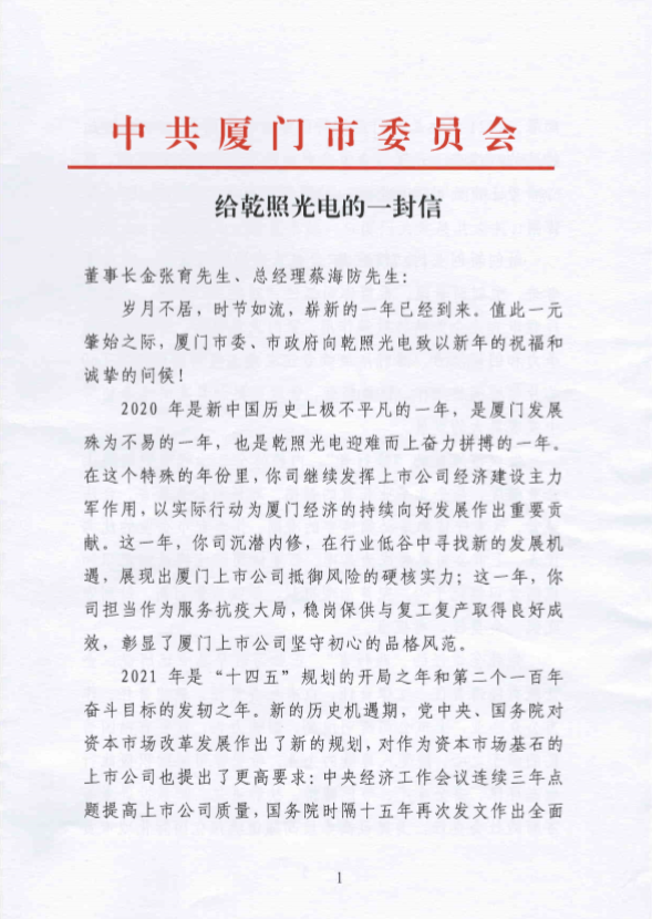 近日,乾照光電收到中共廈門市委員會(huì)的來(lái)信,信中廈門市委、市政府對(duì)于我司過(guò)去一年的發(fā)展給予了積極的評(píng)價(jià),并在一元肇始之際,對(duì)我司表達(dá)了新年的祝福和誠(chéng)摯的問(wèn)候,同時(shí)就我司2021年的發(fā)展規(guī)劃做出重要指引。