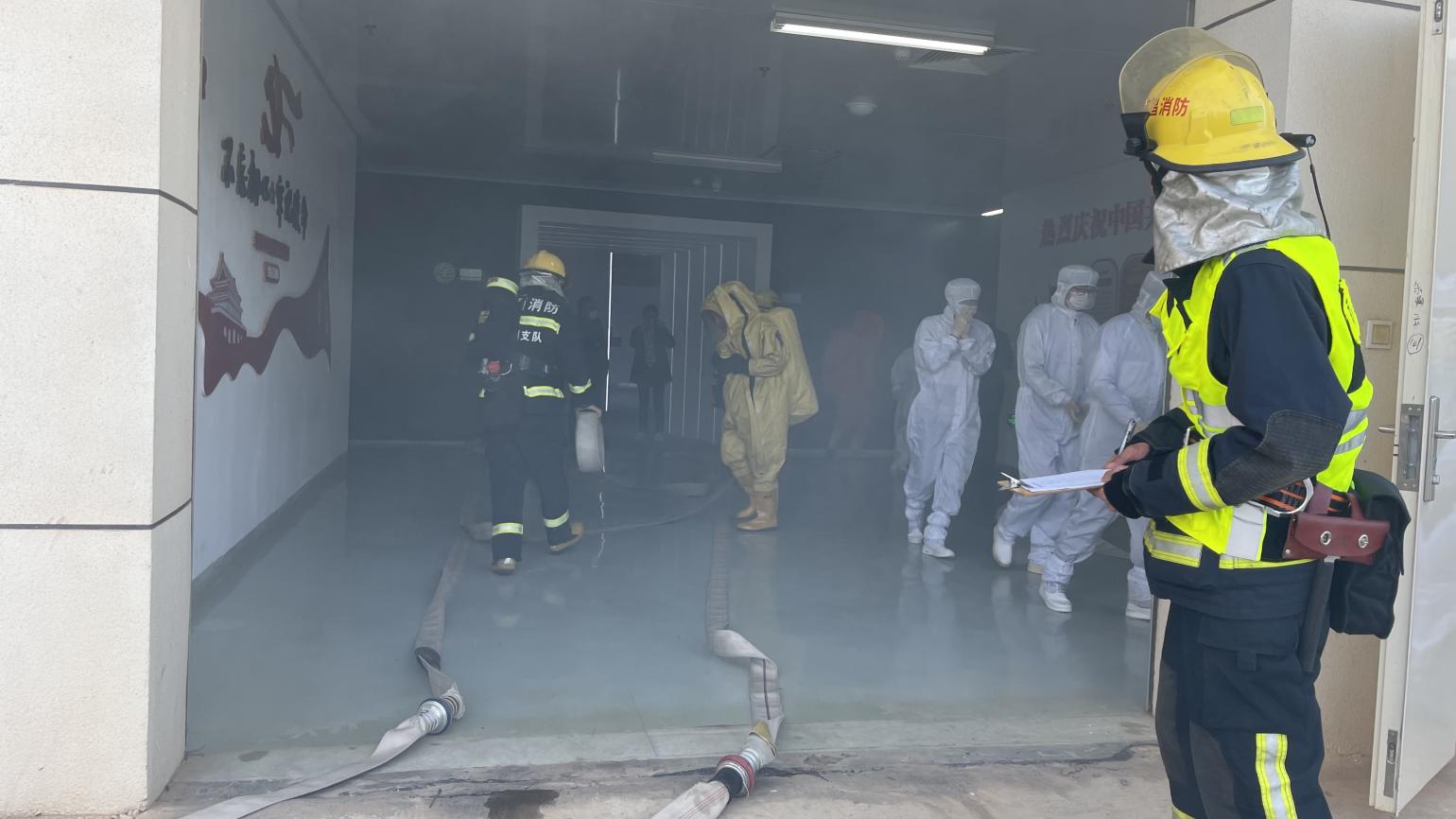 一陣急促的警報聲拉開“下半年逃生疏散演練”活動的帷幕,隨后黃色煙霧迅速彌漫整個辦公區(qū)域。根據應急預案逃生指令,消防廣播響起后各部門人員按照消防通道迅速撤離到室外安全集合點,并清點人數,逐級向上匯報。全廠人員全部安全疏散完畢后,現場隨即進行實戰(zhàn)演練。