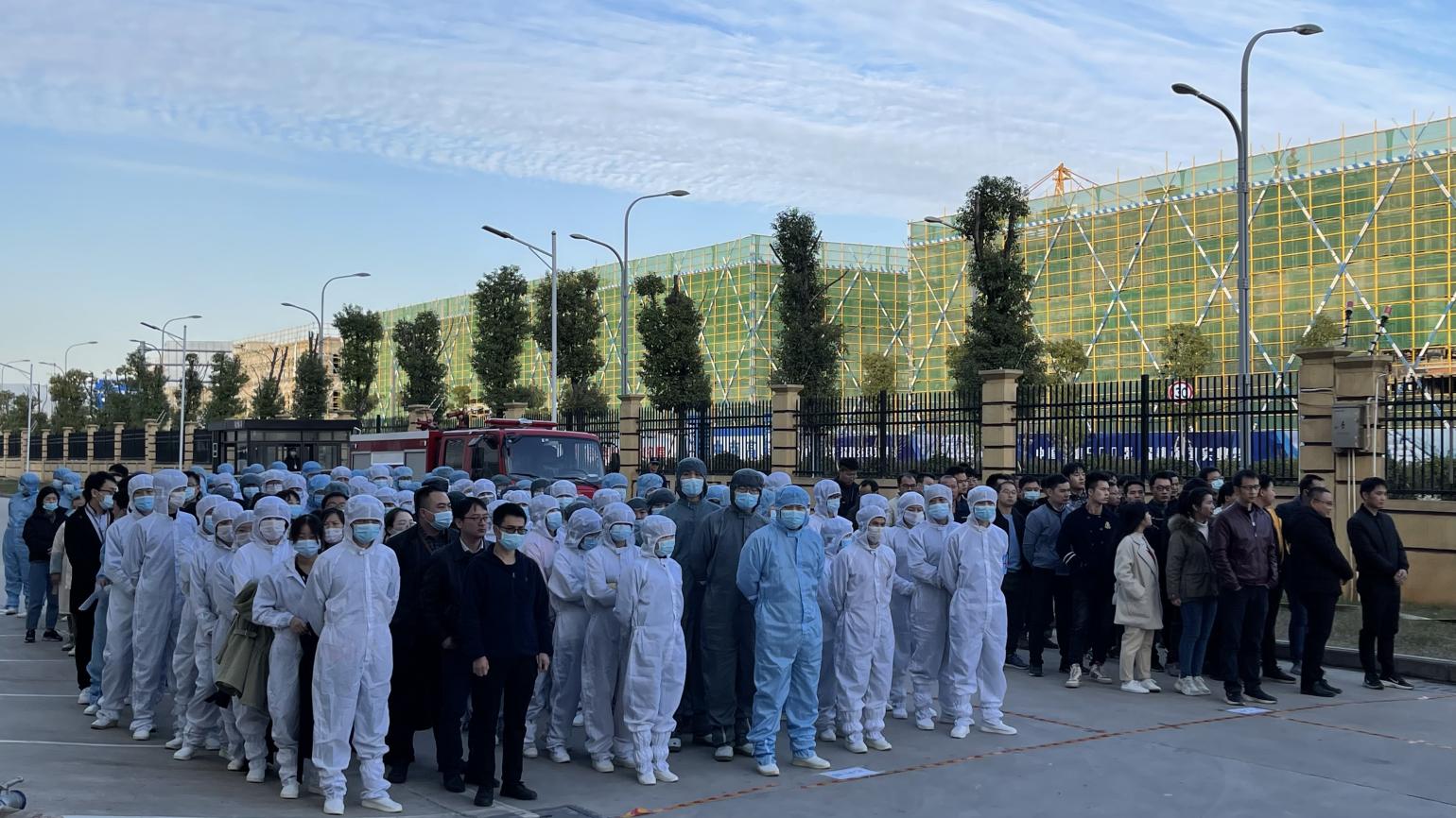 上午8:35演習開始,外延車間塔燈聲光報警。車間人員快速有序撤離至緊急疏散集合點,應急預案啟動,搶險組進入現場排查險情。