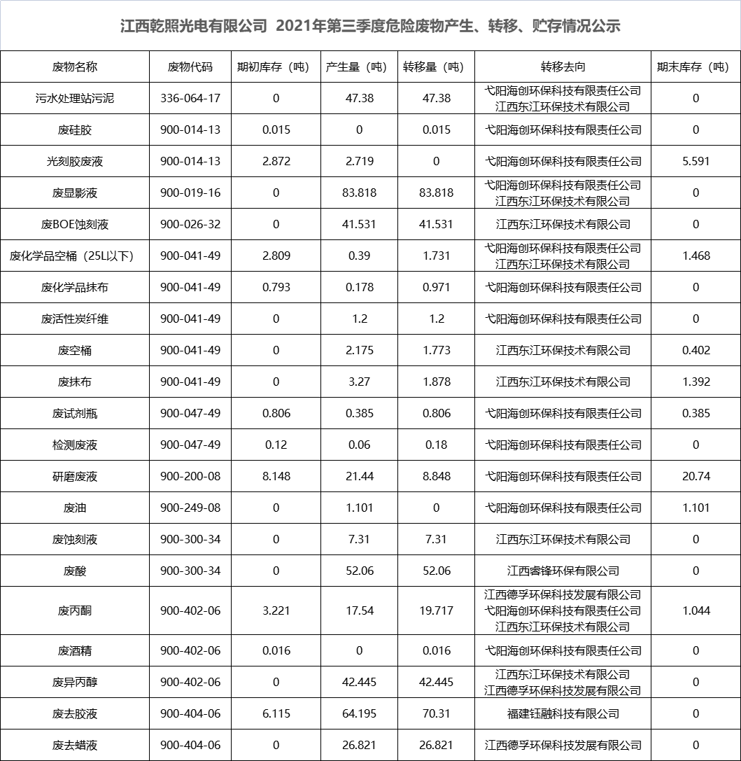 江西乾照光電有限公司 2021年第三季度危險廢物產(chǎn)生、轉(zhuǎn)移、貯存情況公示